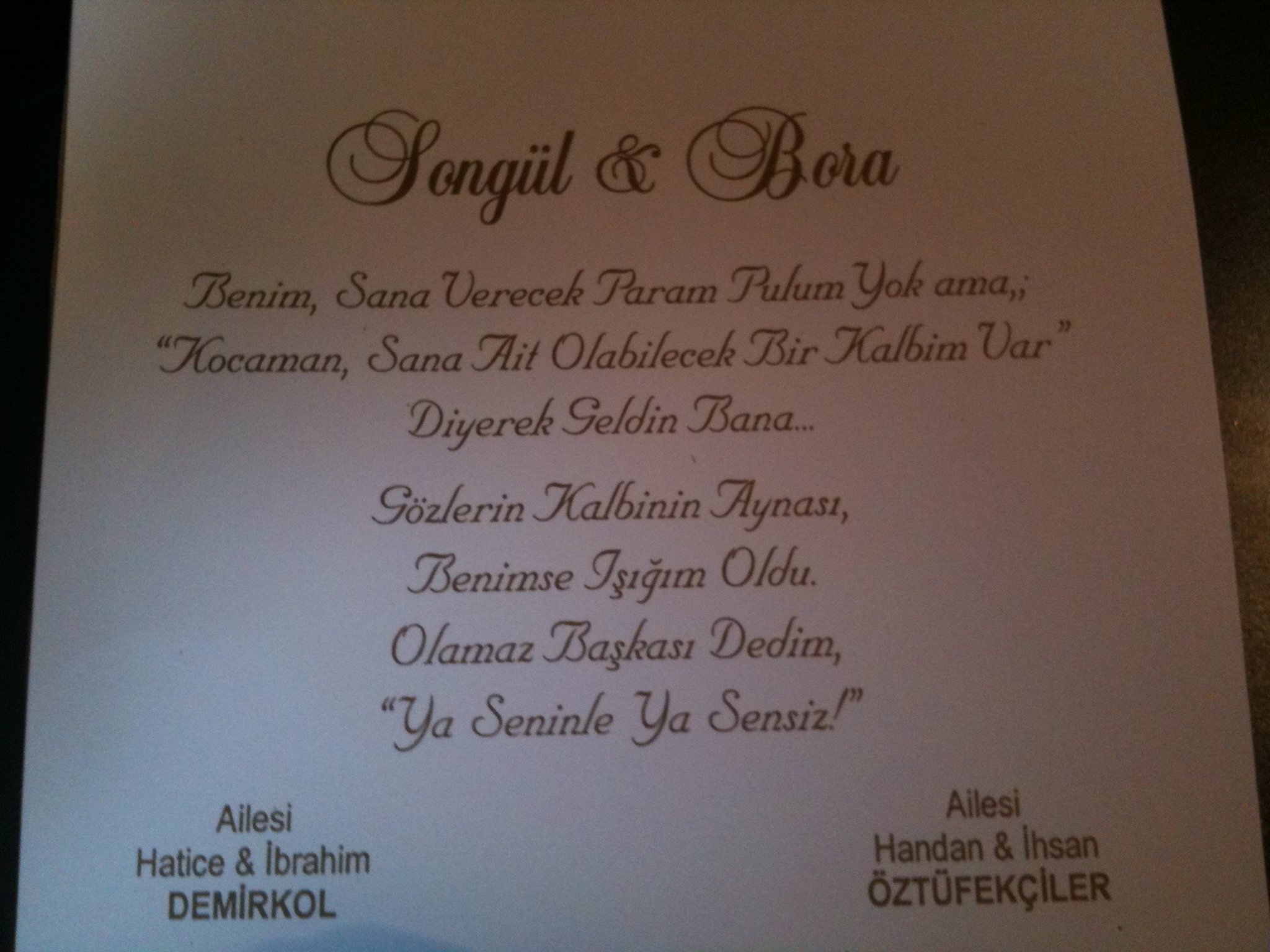 Veeee bütün iyi dileklerimizi bırakıp döndük.  Buradan, sizin nezdinizde; yeni başlangıçlarında Bora ve Songül’e;  gözlerindeki ışığın, aşkın tükenip sönmeyeceği, mutlu nice nice yıllar dilemek istiyorum. Sevgiyle…