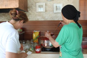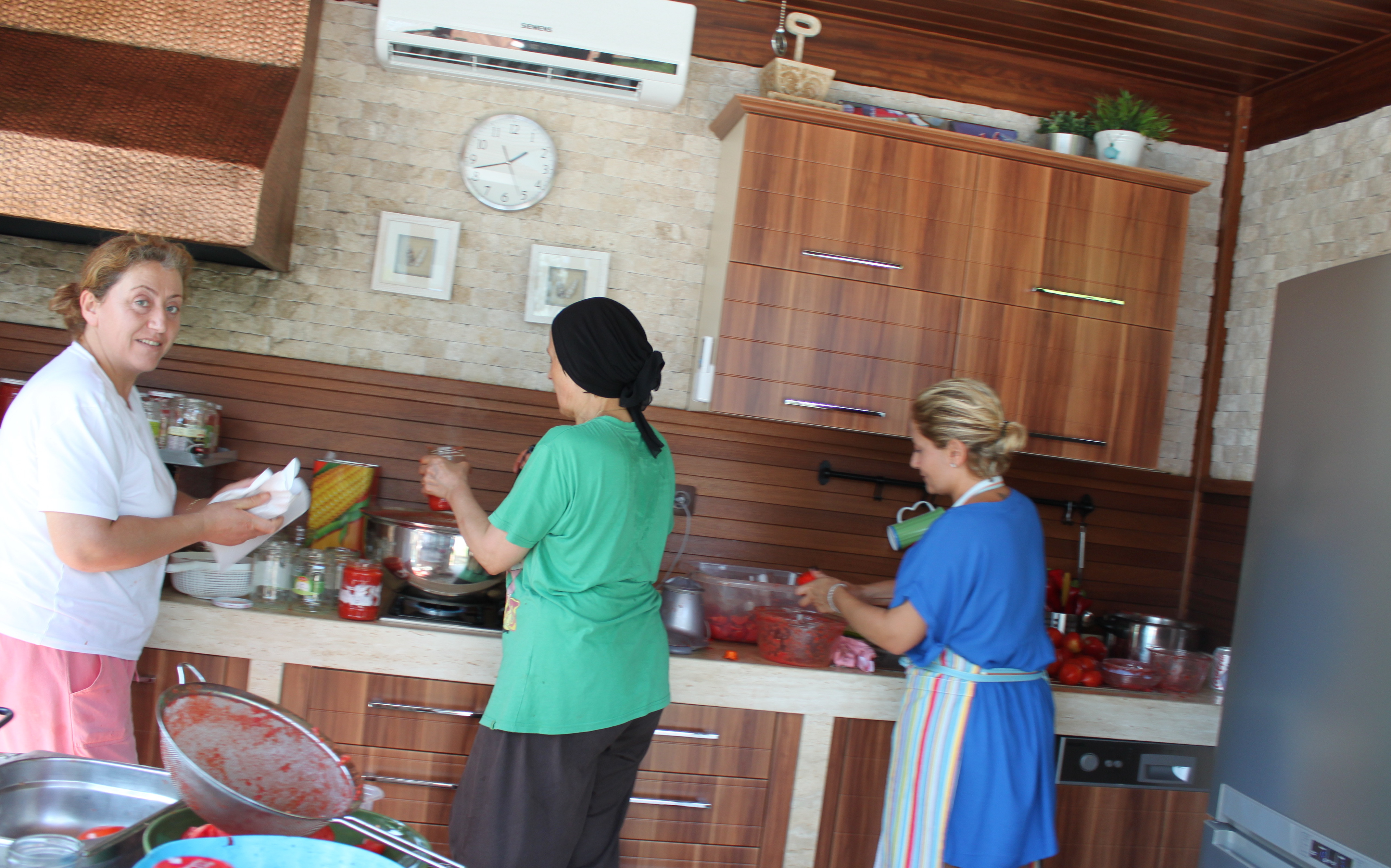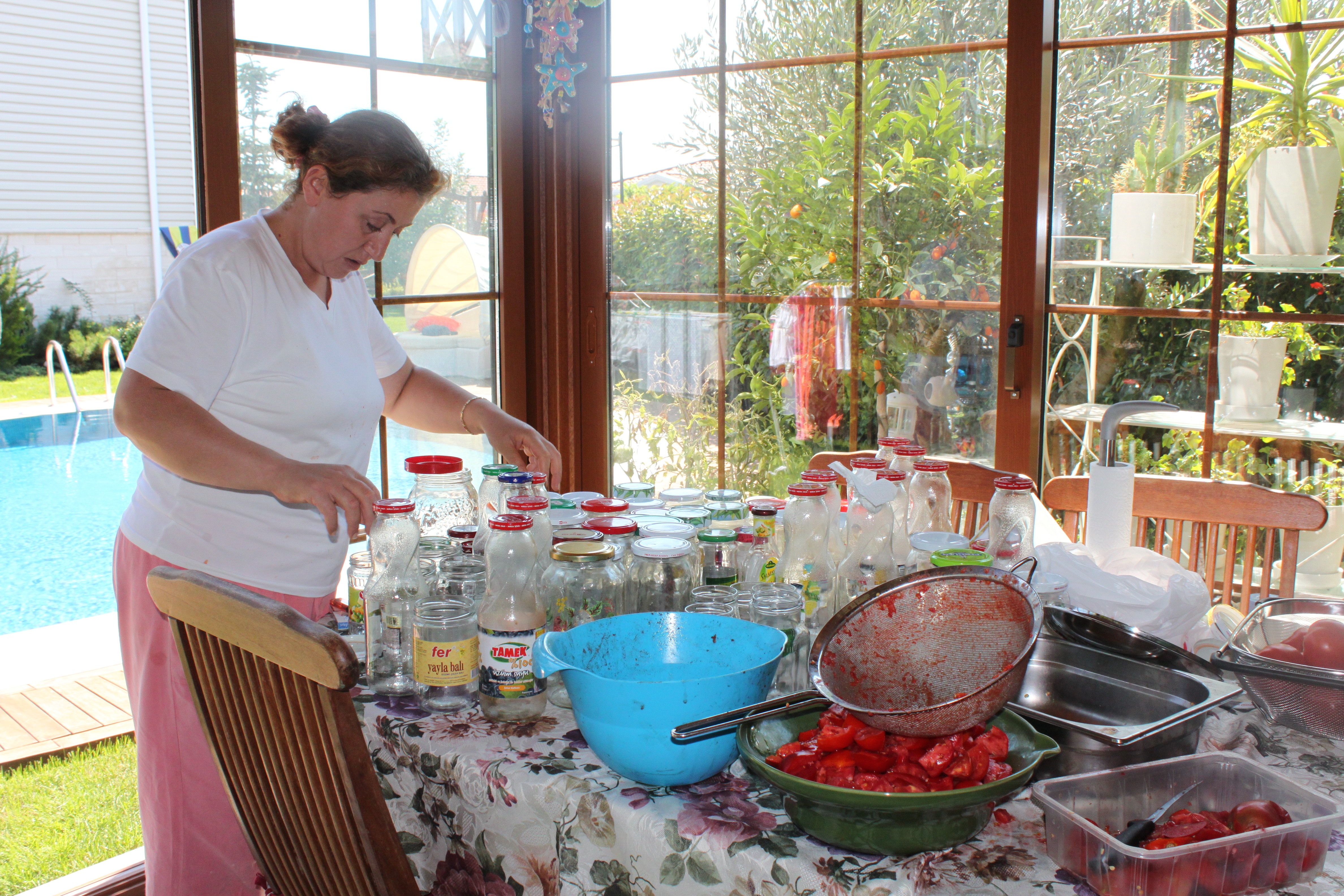 Etkinliğin adı; kışın kullanmak için domates suyu hazırlamak. Tamam gerçekten müthiş lezzet katıcı ve sağlıklı birşey ama zor yahu. Takribi 80-90 kilo domatesten bahsediyoruz. Etkinlik süresince değişken ruh halleri içindeydim; işe başlarken bir acemilik heves, sonrasında asla bitmeyeceğine inanmak, sonrasında bittiğine inanamamak. Fon da; TRT FM frekansındaki radyomuzdan yükselen şarkılar, kahkahalarımız, çalıştıramadığımız mutfak robotuyla mücadelelerimiz, kesiklen- yanan eller, boş çıkan tüp falan derken kumbaraya atılacak bir hoşluk daha… Bu arada kayınvalidemin evlendiğinden beri, her yıl, tahminim 42-43 yıldan beri bu işi yapıyor olduğunu düşününce?